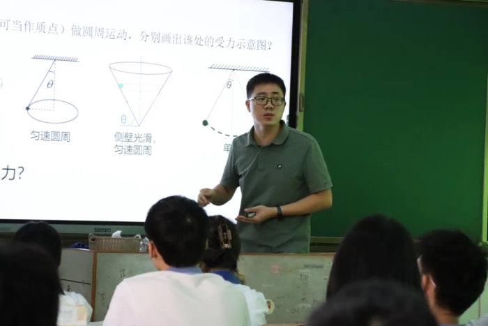 首先,朱老师在物理科组全体老师的陪同下听取了王永松老师的高三一轮复习公开课《圆周运动的动力学问题》。课堂上,王老师首先引导学生复习了向心力的定义和向心加速度的公式,而后围绕寻找向心力这一核心,将牛顿第二定律求合力的解法应用到圆周运动中,将理想模型与生活情境相结合,为学生掌握圆周运动的动力学解法下足了功夫。整节课由易到难,层层推进,很好地完成了教学目标。