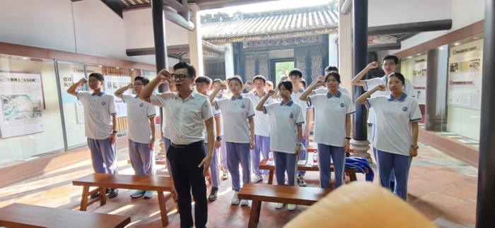 五桂山石莹桥村山明水秀,绿树成荫,曾是中山打击日寇,以少胜多著名战例的发生地。这里,记载着先辈勇担责任,敢于战斗的英勇事迹。研学小组根据规划好的路线,首先参观了珠江纵队司令部旧址,也称古氏宗祠,通过观览一幅幅图片、一张张旧物,一段段视频,了解了英勇的中山人民在中国共产党领导下所开展抗日斗争的英雄事迹,感受着他们的顽强不屈和坚定意志。在这蕴含着红色基因的基地,同学们在莫宗迪主任的带领下,重温了入团誓词;党办主任暨课程建设组主持人马立华老师为大家详细讲解了当年中山的红色故事;梁天钧级长带领同学们激情朗诵了王昌龄《出塞二首·其一》和李清照的《夏日绝句》古诗词,同学们的爱国之情油然而生。而后,梁业兴和刘金蓉级长为学生们分别从数学、地理的角度分析当年中山五桂山人民抗战时的所运用的知识,引导同学们感受中山人民的智慧,立志更努力学习科学文化知识,将来真正为祖国各项伟大事业添砖加瓦。最后皮益辉级长暨课程建设组成员呼吁同学们赓续红色文化,弘扬民族精神,争做先锋模范,积极向党组织靠拢,争取将来早日加入中国共产党,为共产主义事业,为中华民族伟大复兴而奋斗。
