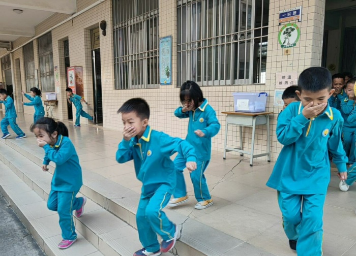 8点整,随着警报声响起,各班班主任和科任教师及时准确地组织学生,迅速进入紧急疏散状态。在老师的带领下,全体学生弯着腰、猫着步,用手帕、毛巾等捂住口鼻,快速而有序地按预定疏散路线,从“灾害现场”逃离,疏散到学校的操场上。1400多名师生训练有素地从各个室场撤离到学校小操场空地,随后各班班主任清点人数,汇报给学校安全主任。能如此快速有序地撤离,得益于浪网小学平时对安全工作的重视,师生们在疏散时牢记注意事项与撤离路线。