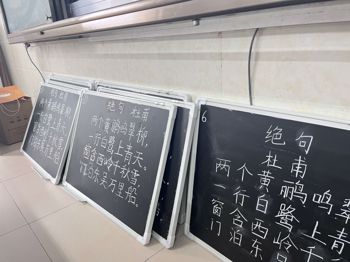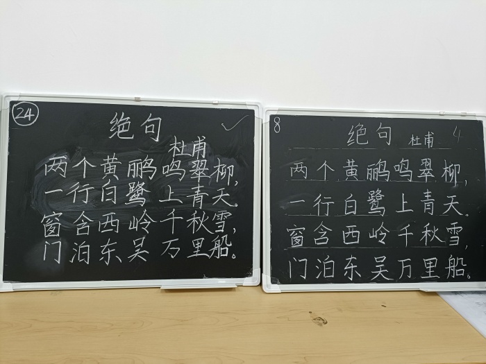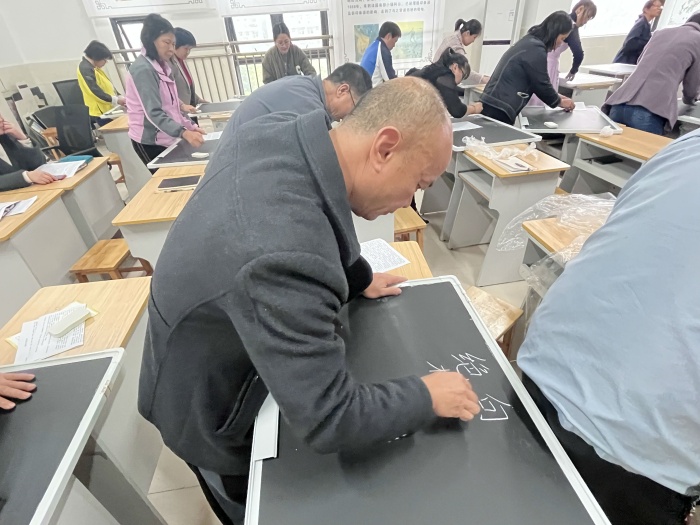 接下来进行粉笔字比赛。粉笔字比赛的内容为中华传统古诗词,在指定的比赛地点完成现场书写。比赛中,老师们全神贯注,凝神运气,尽情挥洒手中粉笔,写下一串串或端正、或清秀、或刚劲的字体。