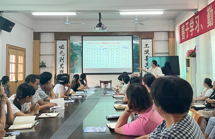 接着,数学科组长梁桂娣老师以期末检测成绩为依据,结合学生平时学习情况,认真分析学生目前存在的问题,并提出后续教学的改进措施。梁老师就数学科组近三年各年级的数学考试成绩与街道上其它的兄弟学校进行对比分析,剖析出各年段、各班级目前的优点与不足,并提出了:抓基础、重计算、关注知识衔接、明确培优辅差方法、提高课堂教学质量共五点教学建议。对于口算题、笔算题如何进行日常训练也给各位老师进行了明确的方法指导。