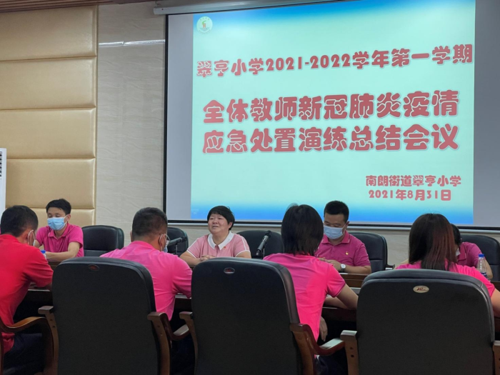 为严抓校园安全管理,做好疫情防控工作,全面提升疫情防控组织协调和应急处置能力,2021年8月31日上午,翠亨小学全体教师、职工代表以及六(1)班部分学生代表在学校里举行了新冠肺炎疫情应急处置演练。