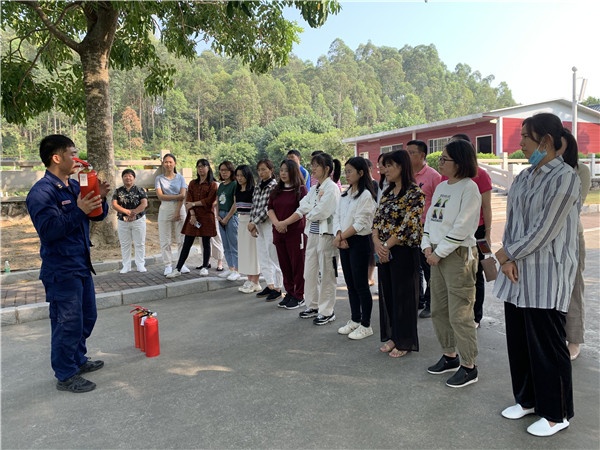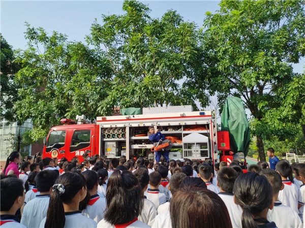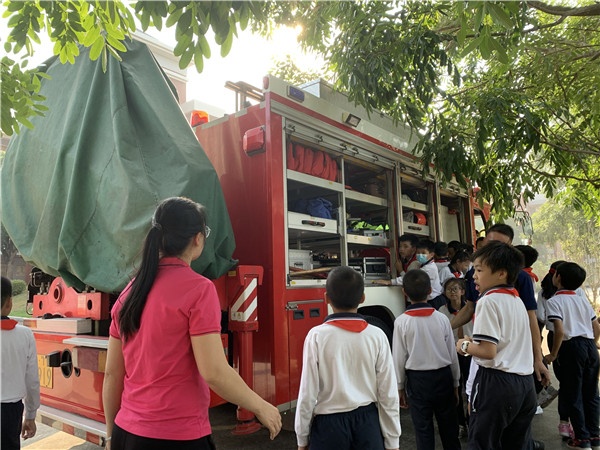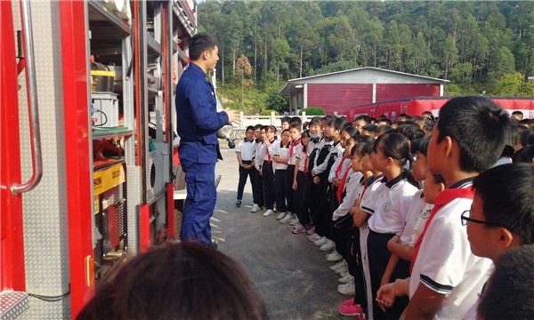 整个演练活动共分四大流程:一是易思副校长详解本次演练活动;二是疏散演练;三是南朗镇消防官兵指导教师们如何正确使用后灭火器;四是学生分班级参观消防车内装备、体验经过模拟火灾现场。