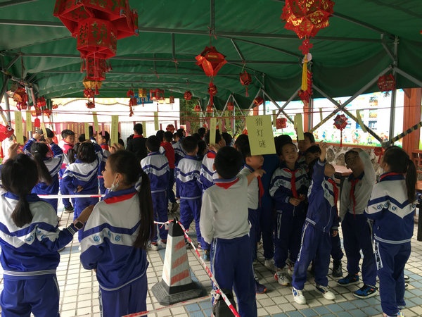 看!横门小学刚进校门处悬挂着精美的花灯。据悉,这些花灯是学生们在家变废为宝制作出来的,精美且环保,非常有创意。在德育处的组织下,各个班级分别进行猜灯谜的活动。五彩的灯谜悬挂在花灯下,“半青半紫。(打一字);凤凰台上凤凰游 (打数学名词一)……”每个灯谜都那么好玩有趣。孩子们穿梭于花灯间,猜出来的,欢呼雀跃;猜不出的,紧皱眉头。