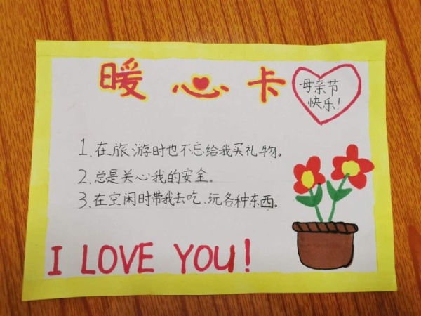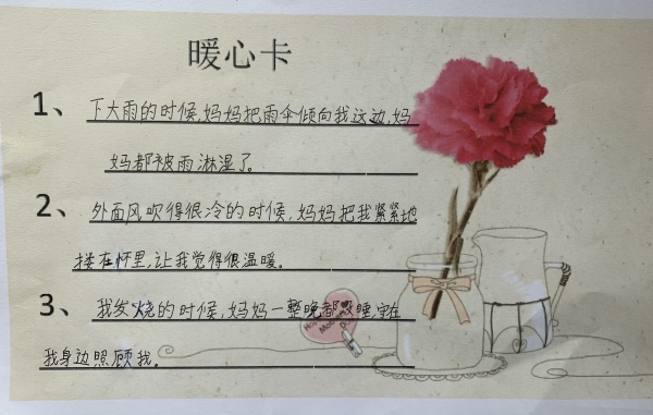 活动三:表达爱。母爱如春夜无人知晓的细雨,如黄昏穿过林间的晚风,如清晨的每缕阳光,陪伴在你不经意的时候。母爱是悄无声息的,在感受爱的同时,云小的队员也善于表达爱。队员们纷纷制作一份暖心卡,把妈妈做得最暖心的3件事写下来。同时,为妈妈献上亲手制作的一份小礼物和节日的祝福。