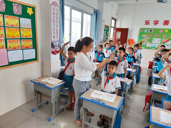 为激发队员爱党爱国爱队的热情,增强少先队员的光荣感和使命感,6月22日上午,南区北台小学组织开展了“红领巾心向党”少先队敬队礼活动。