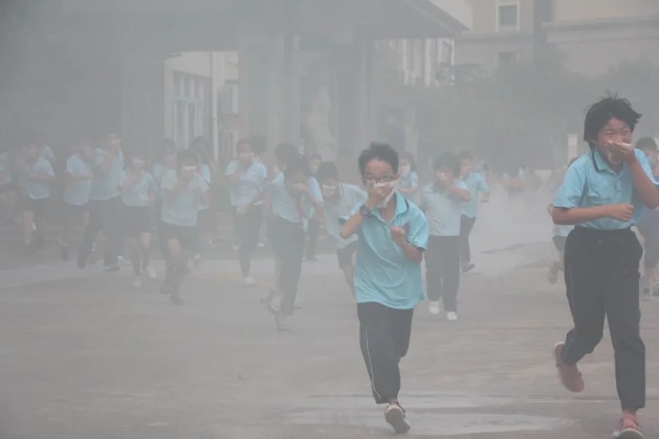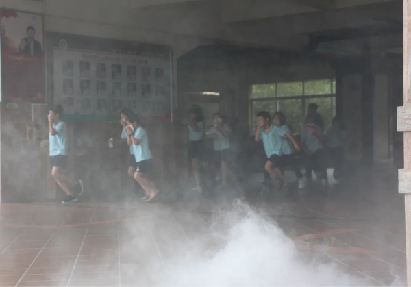 此次消防演习,是在学生完全不知情的情况下举行的,让活动的实际效果更加明显。8时50分,各个楼层突然浓烟滚滚,刺耳的警报声传来,各位老师按照预案的要求各就各位,所有学生在老师的组织下,迅速把毛巾或纸巾打湿,按照平时指定的路线弯腰前进,有序疏散到了安全的地点。