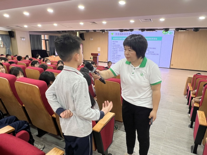 接着,郭老师通过现场问答、案例分析等多种形式,向同学们介绍了青春期身体以及心理的变化,教育学生学会“悦纳自我 尊重他人”,正视青春期心理变化,交往应有度,呵护心理成长。在讲座的过程中,郭老师一直鼓励学生克服羞涩,积极参与,踊跃发言。郭老师的讲座浅显易懂,生动有趣,气氛活跃,赢得学生们一阵阵掌声。