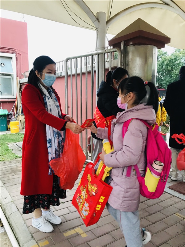 三乡镇白石环小学,红色外墙沐浴着晨曦,透着浓浓的新春气息,一副长长的对联高挂在教学楼前,广场旁的草地上带着虎娃的“新年好”赫然醒目,树上吊着学生的各式手工灯笼。校门口,全体行政、值日教师和4位礼仪队员满面笑容分别在列队正门与侧门,给到校的每一位师生发新年礼物——利是封,利是封里装着利是糖、棒棒糖和祝福书签。千余名师生接过礼物,相互祝福着,迈着轻快的脚步进入校园,走进具有同样春意的教室,教室的黑板上写好了欢迎词,挂上了学生相关“春”的作品。