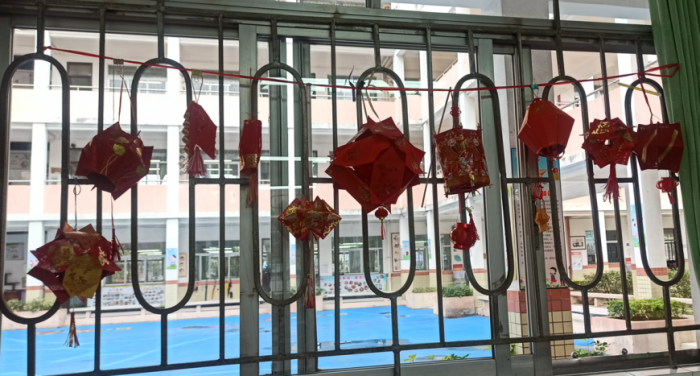 为营造浓厚的节日氛围,在寒假期间各班孩子们与家长一同制作灯笼或春节有关的剪纸等手工。孩子们充分利用彩纸、利是封、空瓶子等身边的材料,变废为宝,制作出了一个个创意无穷的环保花灯,迎接元宵节的到来。走在教学楼的走廊上,处处张灯结彩, 一个个精美的花灯,吸引了师生们纷纷驻足,他们时而欣赏,时而赞叹。一盏盏花灯成了校园里一道喜气洋洋的风景,整个校园充满了元宵节的喜庆气氛!