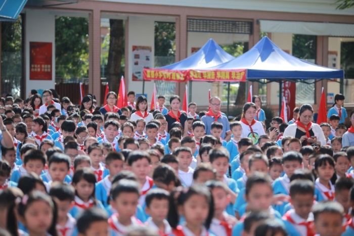 看,校门口的大队旗迎风招展,学校大队委员们在校门口欢迎每位队员,进校园的队员们纷纷向队旗敬个礼,一个队礼,一份光荣,满满的仪式感,更加坚定他们时刻准备着为共产主义奋斗的决心。