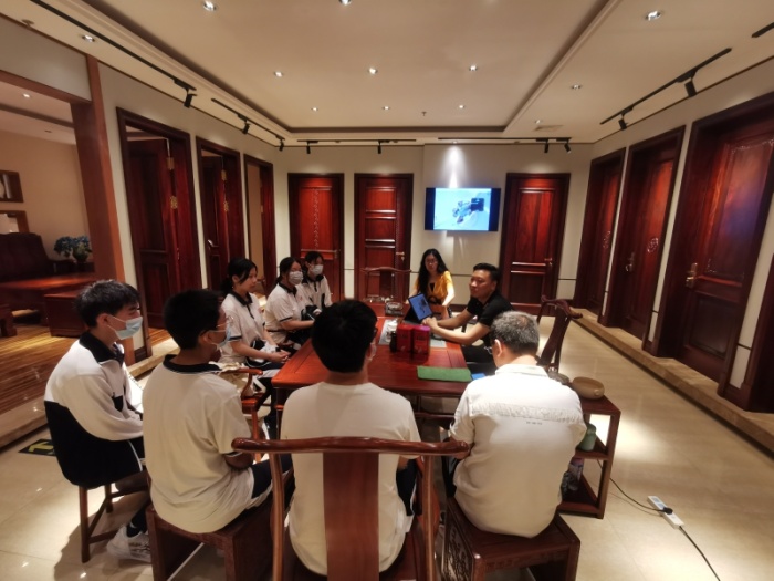 姚从超总经理介绍公司的整体构架,带领师生们参观营销展厅、工艺技术部、固装工艺车间、产品研发部等部门,讲授红木全屋定制的全部生产过程,说明学生来实习将从事的工作任务等。