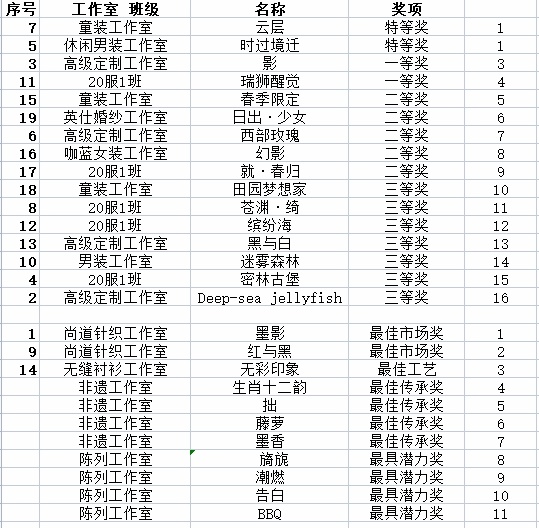 现场展出的27个系列中,其中工作室作品22个,班级学生作品5个,共评出特等奖2个、一等奖2个、二等奖5个、三等奖7个,最佳市场奖2个,最佳工艺奖1个,最佳传承奖4个,最具潜力奖4个。