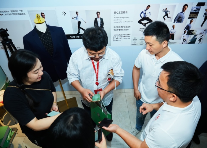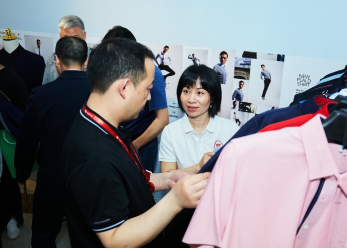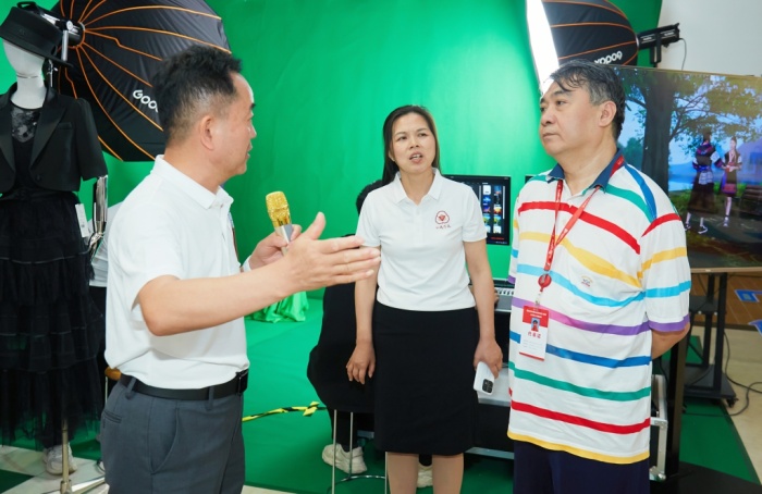 刘杰巡视员来到沙溪理工学校展区,了解学校专业特色和办学成果。展区内,智芯服饰展出无缝工艺制造男装,女生战袍展出高级定制女士晚礼服,帼样范展出中国纹样系列女包,深受嘉宾们喜欢,不少人当场购买、加企业微信交流。特别是买它电商展区展示的元宇宙虚拟制片一体机技术,正在由两位学生按照日常教学要求,通过绿幕及虚拟现实场景进行族服饰的直播销售,吸引观众驻足。