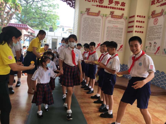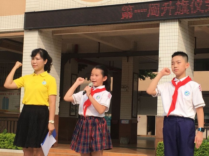 升旗仪式由队干梁乔峰和郑佩怡同学主持,首先进行的是新生跨入龙门的仪式,六年级的哥哥姐姐向一年级小朋友亲切地说:“你好,小弟弟(妹妹),让哥哥(姐姐)带你过龙门!” 哇哇哇,无比自豪!他们牵着弟弟妹妹的手一起跨入龙门了,一年级新同学还戴上了学校行政授予的“鲤鱼标志”,寓意从今天起,他们就正式成为龙小鲤了。
