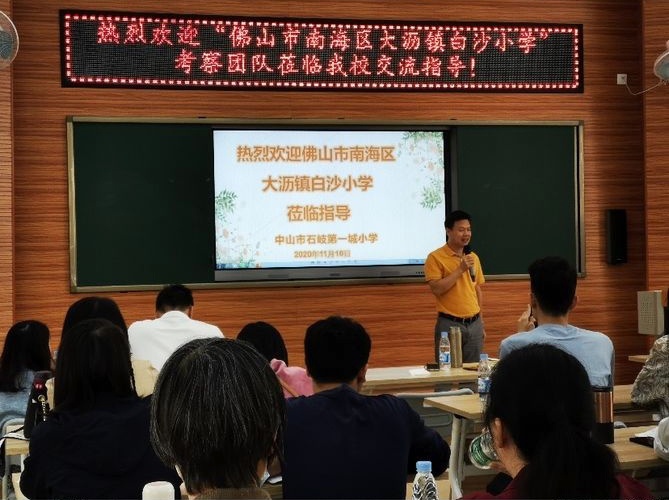 11月10日上午,佛山市南海区大沥镇白沙小学的行政领导和骨干教师们来到石岐第一城小学交流学习。梁炳根校长和学校“430科普微课堂”课题组成员们热情接待了来宾,并带领他们参观校园,了解学校“科普中国校园E站”建设情况。
