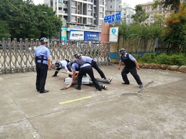 先由派出所民警现场技术指导学校保安当有“暴恐分子”冲进学校时,该如何运用钢叉、盾牌对暴恐分子进行拦截。钢叉可以用来勾腿、叉脖子、叉住腰,配合防暴盾牌非常有威慑力。在民警的耐心指导之后,石岐第一小学的保安们开始进行情景练习,当出现暴徒时如何更迅速有效地行动。多次练习后保安们逐渐掌握了有效制服暴徒的技巧。后在演练过程中,保安人员反应迅速、手持防暴棍、钢叉集中与 “暴徒”周旋,配合默契,采取处置措施及时、合理,表现出良好的处理危机事件的能力。