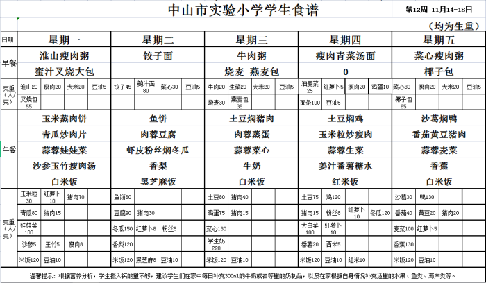 中山市实验小学第12周学生食谱