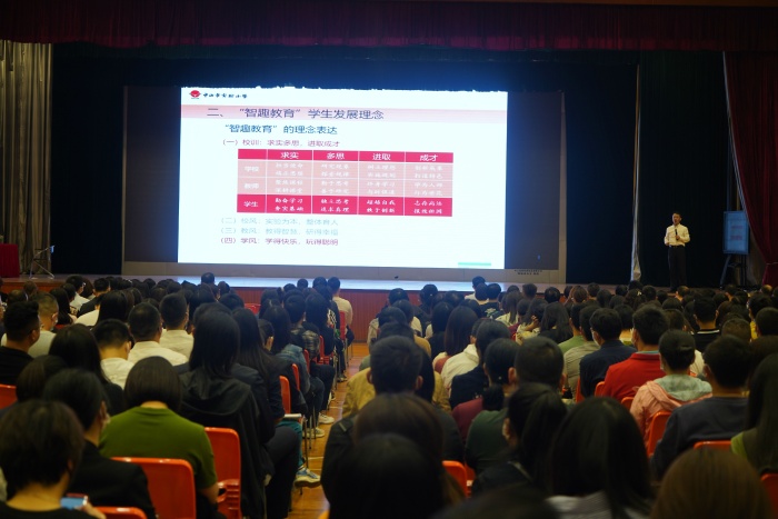 会议上,徐铭侃校长围绕着德、智、体、美、劳五个方面,作了题为“‘智趣教育’学生发展的目标、内容与实践”的讲座。首先,徐校长徐校长选取了《习近平总书记关于教育的重要论述》中关于“教育公平”的讲话,分析当前教育仍处在发展阶段,教育资源更均衡、更公平是人民对美好教育的向往。要学习二十大的精神,全面贯彻党的教育方针,落实立德树人根本任务。