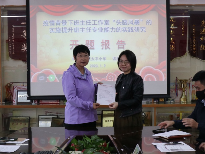 首先,结合育人需要、办学需求,石岐太平小学刘晓君校长对《疫情背景下班主任工作室“头脑风暴”的实施提升班主任专业能力的实践研究》作详细开题报告,分别从选题依据、研究框架、思路方法、创新之处、预期成果、研究基础和条件保障六个方面进行阐述,并小结了阶段研究的内容、过程、成果,更进一步提出了下一阶段研究工作的具体规划。