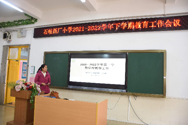 回首、沉淀,是为了更好地蓄力;总结、提升,是为了更好地前行。之后,杨翠萍校长对上学期学校的各项工作做了全面总结。她说,2021年,是西厂小学砥砺奋进的一年,是全体师生共同进步的一年,在习近平新时代中国特色社会主义思想的指引下,在上级领导的关心下,在家长朋友的配合下,全校教师用如磐的初心、奋斗的姿态,书写着教育者的使命担当,凝心聚力,拼搏进取,推动学校各项工作取得新成就,各项事业发展行稳致远。她高度赞扬了全体教师敬业爱生、甘于奉献的精神。杨校长对学校新学期的教育工作也提出了新要求:安全第一,切实做好疫情防控工作;守正创新,切实增强德育工作实效;常思五“问”,切实提升课堂教学质量;做实细节,切实推进“双减”工作落实等。杨校长以习近平总书记的话语“一个人遇到好老师是人生的幸运,一个学校拥有好老师是学校的光荣,一个民族源源不断涌现出一批又一批好老师则是民族的希望。”寄语全体教师,希望老师们争做有理想信念、有道德情操、有扎实学识、有仁爱之心的好老师,在新学期脚踏实地、勤奋工作,携手书写西厂小学发展的新篇章!