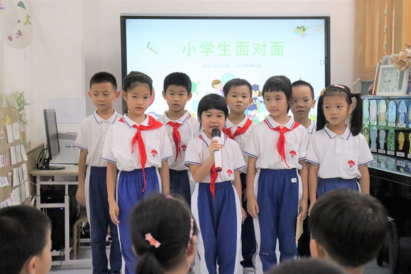 首先,一年级的学生代表来到大三班,为他们认真地解答了之前互赠书信中提到的关于小学生活的疑问。交流过程让小朋友加深了对小学生活的了解,也激发了他们对小学的向往和期待。