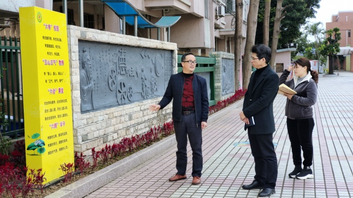 在配合校门口保安做好测体温等防疫措施后,邓炜明副局长即步入校门,对周边的环境进行视察和了解学校的概况。邓副局长指出要把社会主义核心价值观、关爱未成年人等宣传放在校门口更加显眼的位置。接着邓局长一行走进东方小学阳光大道,李校长分别介绍了东方小学“德以立人、礼以育人、文以化人、武以正人”的办学理念和“以人为本,为了每个学生健康的发展”的办学宗旨,还有“诚信为人、踏实做事”的校训,并就东方小学第三轮五年发展规划提出的培养“三心三气”教师、“六朗”学子,“六合”课堂、“六有”校园等作了详细讲解,邓副局长还饶有兴趣地在《东方娃》童谣和《东方小学赋》前驻足观看,对此表示赞扬。他表示,东方的办学思路和办学做法非常的清晰,能与学校特色有效地结合。