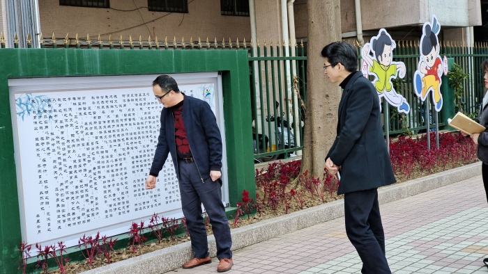 接着,邓副局长在东方行政的带领下来到了教学楼。邓局长心细如丝,认真查看了各教室的布置,公布栏和教室墙壁以及设备设施等情况。在视察国学园时,邓副局长表扬了校园文化和环境的布置,对学校充分利用柱子等空间进行校园书吧和传统文化等布置表示很赞赏,他认为学校让刻板的柱子活了起来,让空间渗透出浓厚的文化氛围。