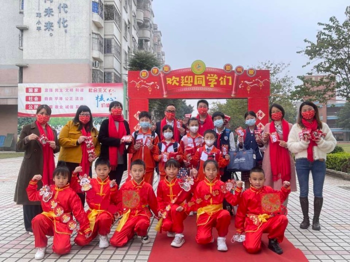 伴随着新春佳节的欢声笑语,孩子们惊喜地看到了带着新年礼物在校门口迎接他们的全体行政领导和六位东方娃。孩子们手里拿着兔福卡和福糖,穿过开学门,走在红地毯,心里美滋滋。在这种温馨的氛围之下,学生们以良好的精神面貌,在操场上参加开学典礼。