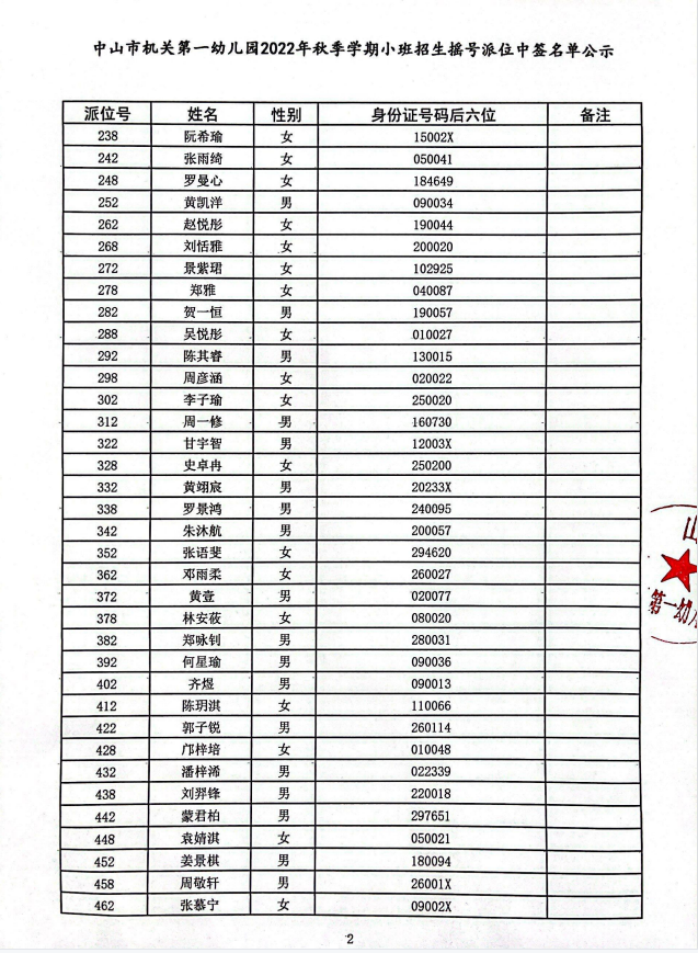 中山市机关第一幼儿园2022年秋季学期小班招生摇号派位中签名单公示