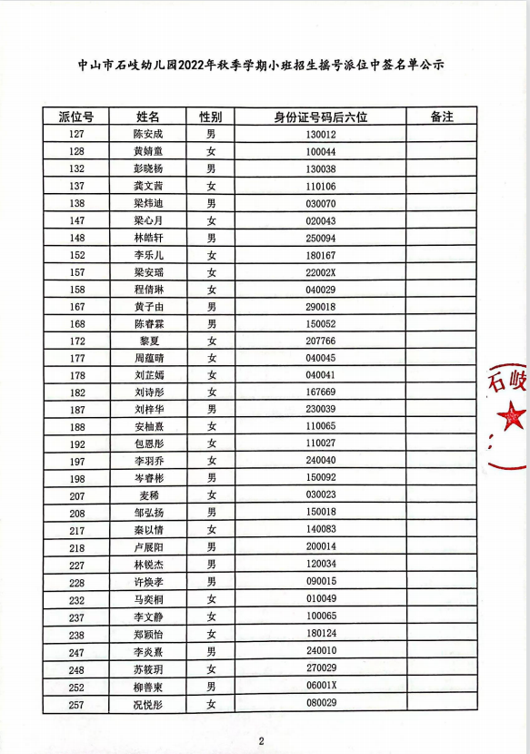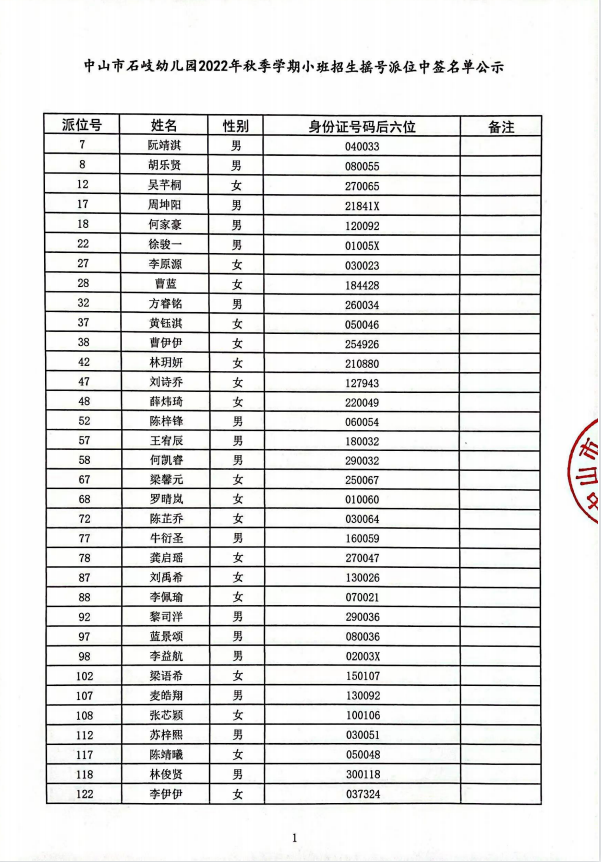 中山市石岐幼儿园2022年秋季学期小班招生摇号派位中签名单公示
