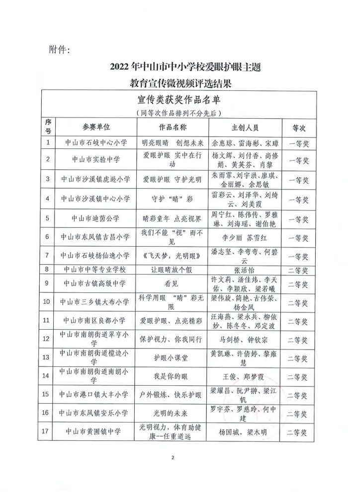 关于公布2022年中山市中小学校爱眼护眼主题教育宣传微视频评选结果的通知