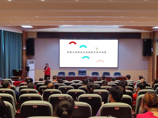 为进一步凸显学校的办学特色与品牌,2022年6月15日下午,五桂山学校在综合报告厅召开专题会议,研讨以“五色”教育为主要载体和抓手,开展学校品牌特色课程。研讨会由李萌校长主讲,全体教师参加会议。