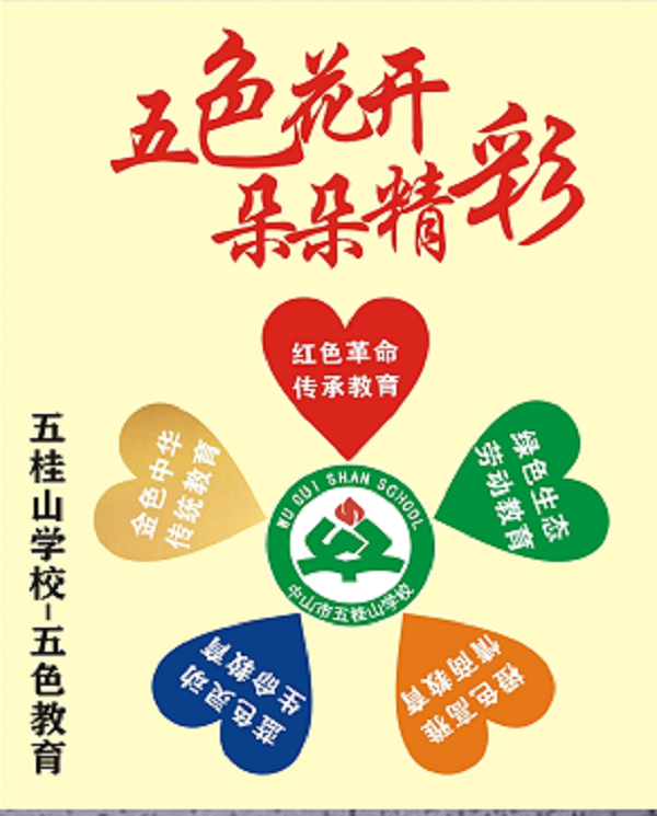 在金色中华优秀传统教育上,五桂山学校秉承“挖掘中华历史 传承传统文化”的目标。在人类历史长河中,中华民族的祖先用劳动和智慧创造了光辉灿烂的文化。中华文化,源远流长,继承和弘扬中华传统文化是凝聚中华民族力量的客观要求,是建设有中国特色的社会主义物质文明和精神文明的现实需要。五桂山学校是中华优秀传统文化教育实验学校,学校拟大力开展赏民俗忆传统、24节气介绍等传统节日、节气教育;通过礼仪文化教育、知恩感恩、倡美德做表率等系列活动,加强传统美德教育;举办主题书画展、经典诵读(《三字经》、《千字文》、《诗经》等)、经典作品书法比赛、粤曲进校园等中华传统文化活动,让学生在参与活动中感受中国文化的丰富内涵,潜移默化中达到知行统一。