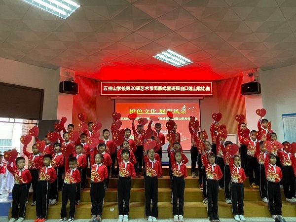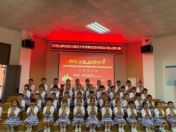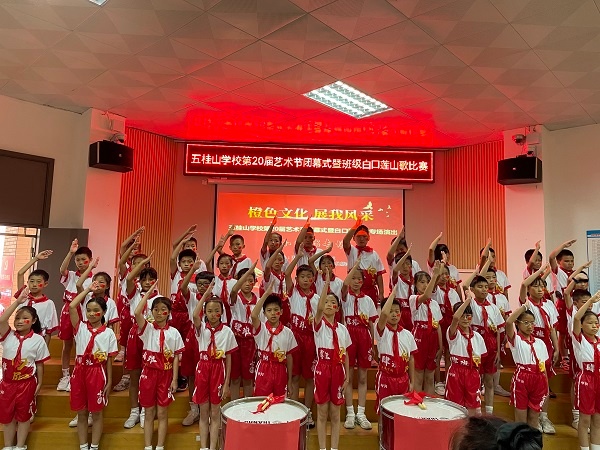 为弘扬爱国主义精神,丰富学生的校园文化生活,五桂山学校围绕“五色教育”之橙色文化教育,开展了为期一个月的第20届艺术节系列活动。11月4日上午,五桂山学校第20届艺术节闭幕式暨白口莲山歌专场活动在小学部阶梯室举行,活动以“歌颂伟大祖国,肩负神圣使命”为主题开展班级红歌比赛。