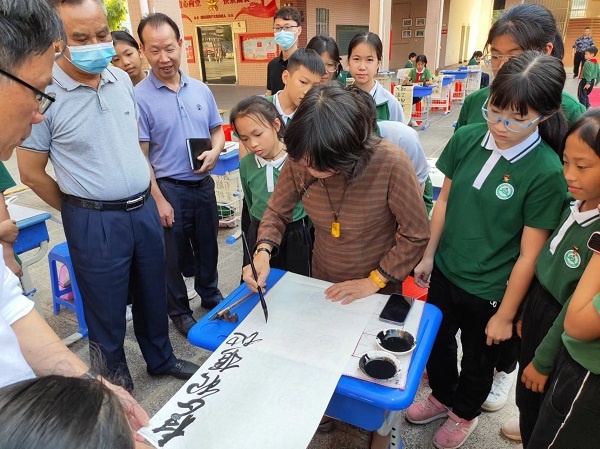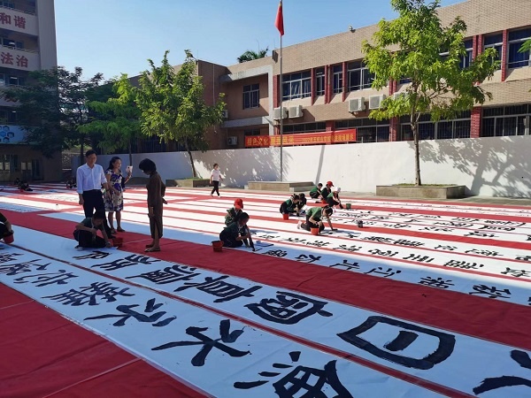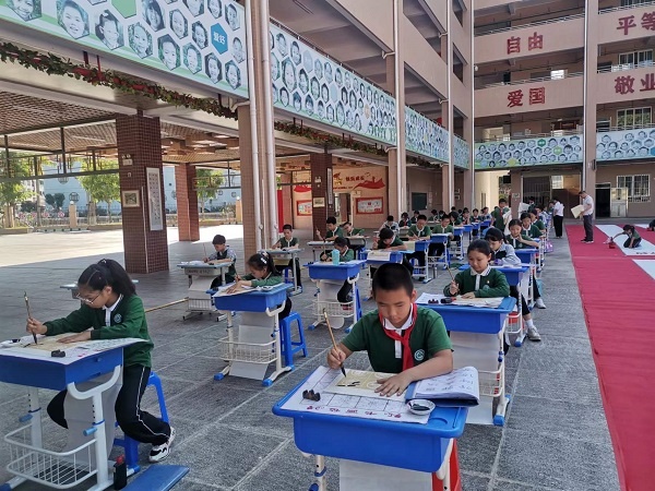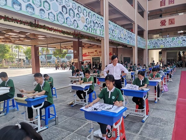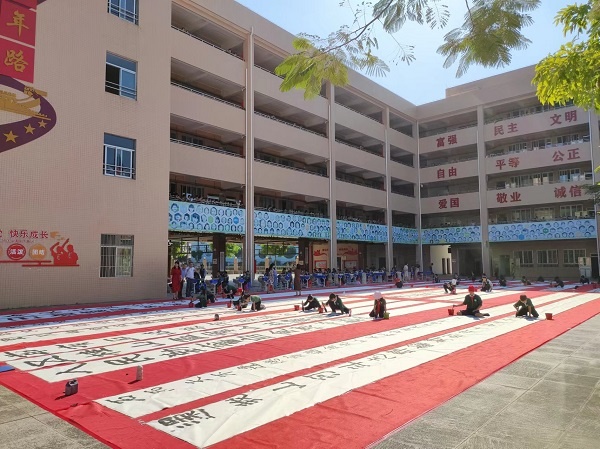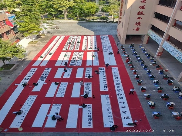参加现场书法展示的为学校中小学书法社团成员,场地分为大字展示区和常规书写展示区,场面蔚为壮观。教学楼下630平方米的地面上铺着红毯,25名同学拿着大毛笔行走于白纸之间挥毫,进行书法创作。常规书写展示区的44名同学满怀激情,用心书写每一个笔画、每一个汉字,尽其所能展示自己的书写水平。作品透着或规范、或严谨、或灵动的气质。书写内容基本选自纪念珠江纵队成立五十周年专辑《五桂烽火》中的诗句。诗句激励着五桂学子书英烈、学英雄。活动中,陈玉玲副校长为大家现场展示书法,鼓励鞭策在场的同学们写好中国字,做好中国人。整个活动,同学们认真品味着书法的艺术魅力,饱蘸浓墨、激扬文字。“书道虽深,志诚可达”,同学们全神贯注,将身心融于笔端,挥洒书写之豪气,一撇一捺,起转锋回,字字溢香。