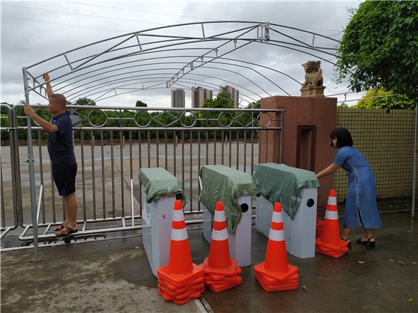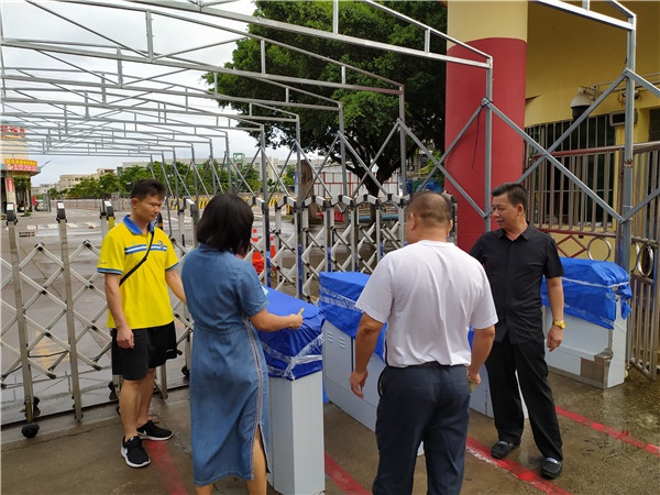 从清晨开始,刘万轩校长就带领全部行政人员举行防台风紧急预案分工会议,随后分工开始对学校外面陈列品进行紧急转移,对存在安全隐患的各类展示牌进行拆除,对学校的门窗、电器设备、大门进行加固。学校食堂采购人员备齐所有应急物资供,确保在校教师有充足的食品供应。全校严格执行“四停”有关要求,及时采取防风防雨应急响应措施,严格二十四小时值班巡视制度,把师生安全放在第一位,保证校园平安。