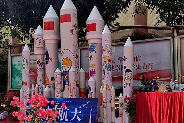 开幕式现场,丰华学校还展示了由信息科技组自行制作的一组大型火箭模型。在宣传我国航天科技相关成就的同时,还配合了声、光、电与烟雾喷射的特效,定时模拟火箭发射。知识面广,趣味性强,科技感十足,这样的展示活动既丰富了学生的知识,又增强了学生的科学观和强国观。