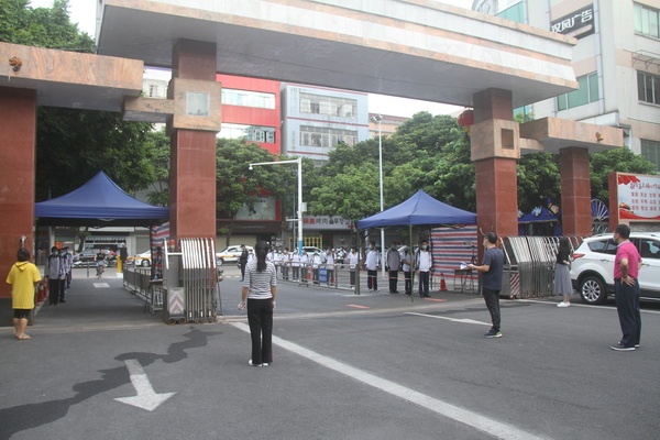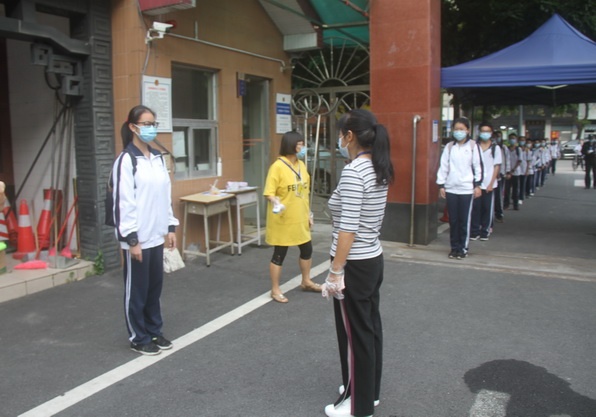 早上7:25分,学生保持间距入校,校门口值日教师用体温枪逐一检测体温,发现体温异常学生,即刻报告值日行政。值日行政将该生带至临时隔离点,由校医检查、询问学生的症状和接触史。校医做好相关记录,向班主任反馈情况,需要就医的即致电家长及时带学生去医院发热门诊。事后由专人对相关场所及时消毒。