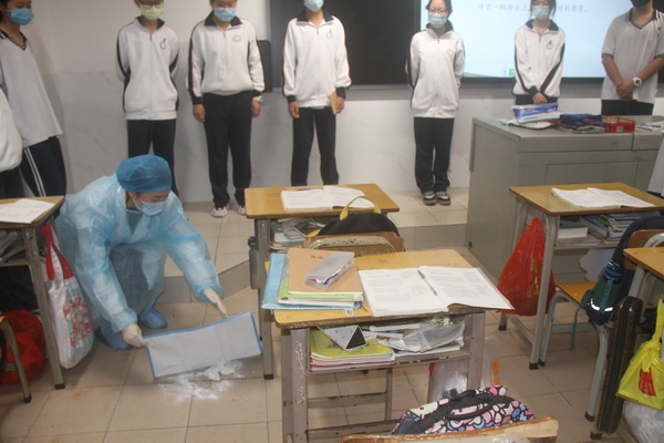 在学校、医院或餐饮业,诺如病毒是引起肠道腹泻聚集性疫情最常见的原因,冬春季是高发季节。常见症状是呕吐、腹泻,部分患者会有发烧和全身乏力表现。结合当前疫情防控形势,为防患于未然,2020年11月18日,小榄镇第一中学以2003班为示范,分三个场景举行了学生返校发烧及诺如病毒呕吐应急处置演练,学校各班派二名学生代表观摩了整个演练。