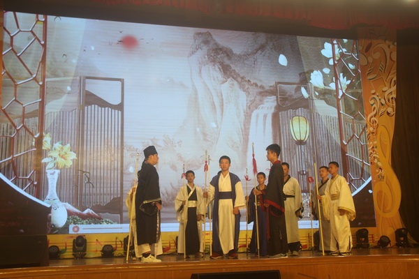 在现场,同学们讲演前后展示的千人巴乌演奏,将讲演会气氛烘托到极点。之后的诗经、周游列国篇、老子悟道、孔门弟子、孙子兵法、合纵联盟之分崩离析、礼记、周易、太史公书、汉书、花木兰、《齐民要术》书名由来、徐霞客游记、本草纲目、跨时代会面、知行合一等节目一个比一个精彩,掌声一阵比一阵热烈。各班演讲的同学用铿锵有力的声音、坚定激昂的腔调,将一个个鼓舞人心、感人肺腑、诱人深思的经典作品演绎得淋漓尽致,带领现场师生领略了波澜壮阔的中华经典。