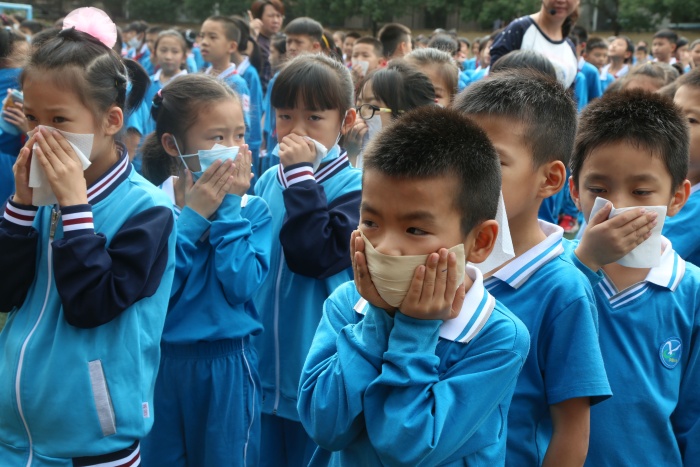 疏散演练开始,急促的警报声响彻校园,各楼层疏散老师立即到岗,上课教师第一时间组织好学生,同学们用湿毛巾或手捂住口鼻,弯腰有序地从指定楼道迅速撤离,全校九百余名师生在不到两分钟的时间里迅速地撤离到安全地带。然后学生观看了模拟火灾现场消防员是如何把火扑灭的。演练结束后,西区消防中队的牛警官就本次消防应急疏散演练活动做了总结讲话,他希望全体学生要加强学习安全自护知识,不断提高自救、自护能力,遇到突发事件能保持冷静头脑,沉着、有序、快速地撤离到安全地带。消防队的指挥员还给全体师生讲解灭火器的使用方法,并现场演示如何灭火;给全体师生讲解火灾现场防毒面具及消防水带的正确使用。师生们个个听得认真,更是兴致高昂地举手要现学现用,都想操作一下灭火器的使用。