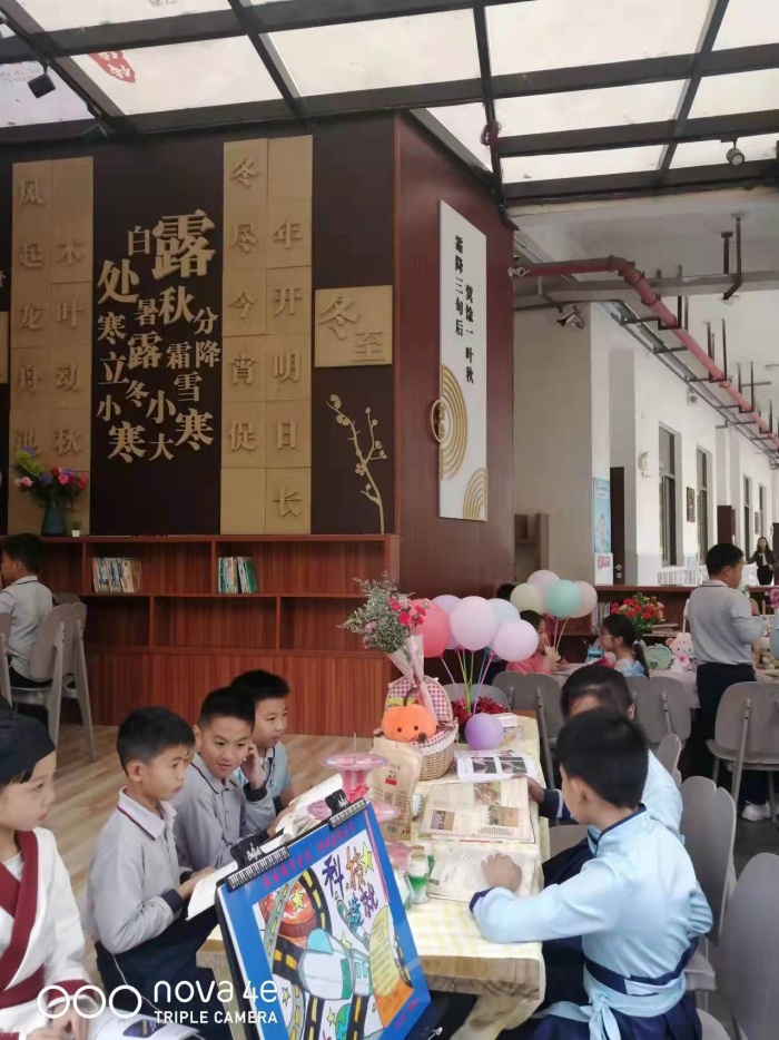 从阅读护照的动态作业到阅读活动的实境体验,本次校园书会由校长赠书、校园一角书会、班级书会三个部分组成。在校园一角和室内等多个场地同步开展各班独具特色的书会。户外场包括诗书廊、星空廊、雅趣阁、阅读馆、风雨廊,分别由二年级4班、三年级1班、四年级8班、五年级3班以及六年级8班等负责。室内场在各班教室进行。活动现场,学生以小组为单位,布置阅读场地,制作宣传海报,撰写广告词,准备推荐书籍,从下午2:30到4:00各项阅读体验活动纷纷开展,校园沉浸在阅读与分享、朗读与微表演、讨论与思考中,书香亦是成长之馨香,铁小时光里动人的一刻永远留在每一个孩子心中。