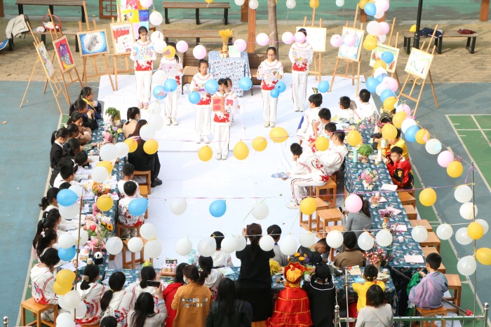 葛老师策划的是一场课本剧表演,从道具的准备到脚本的撰写,从排练到上场表演,她亲历了与孩子共同成长的每一寸时光。给力的家长团,将音响设备搬来现场,地毯要与班服颜色协调,气球要随风飘起来,桌子要铺上漂亮的桌布,好书要分享得恰到好处,现场布置要由孩子们完成。老师的智慧与孩子的成长,家长的参与与孩子的交流,都在一本本书的阅读推进中悄悄完成。(六8班语文老师葛陵带领班级学生在铁城小学厚德廊开展读书会。)