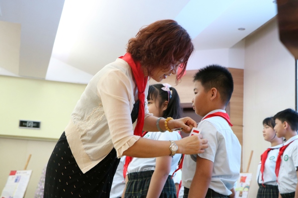 当天还举行了新一届大队委员的就职宣誓授标活动。会上,大队辅导员李老师正式宣布新一届大队委名单,队员们一一登台亮相,在全体代表的注目下,西区总辅导员庄老师、侯洁校长、张文君副校长为新一届大队委员佩戴大队委标志。在星星火炬队旗的印衬下,宋俊航带领大队委们高举右臂,庄严宣誓,一声声铿锵有力的宣誓声,表明了新一届大队委做好大队工作的坚定决心。李老师表示,戴上队标意味着大队委们肩上的责任!希望他们在新的舞台上,能严以律己、模范带头,将大队工作做好。
