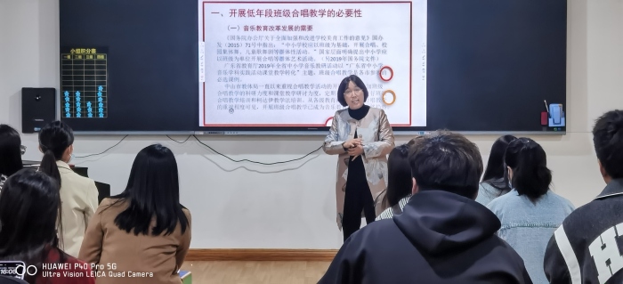 随后,市级课题《小学低年段班级合唱教学实践研究》主持人烟洲小学黄秋玲老师开展了题为《小学低年段班级合唱教学策略分析》的讲座。黄老师通过分析《国务院办公厅关于全面加强和改进学校美育工作的意见》和《义务教育艺术课程标准(2022版)》指出在小学低年段开展合唱教学的必要性,结合中山市中小学生音乐能力底线标准的教学要求,提出在小学低年段开展班级合唱的教学策略:改编教材歌曲,让合唱教学有米可炊;运用柯尔文手势提高学生的音准水平;运用节奏读法培养学生的节奏感;运用丰富的形式训练学生的合唱能力;运用熟悉的歌曲进行二声部练习。黄老师在讲座中特别强调在低年段实施班级合唱教学必须建立在准确歌唱的基础上。