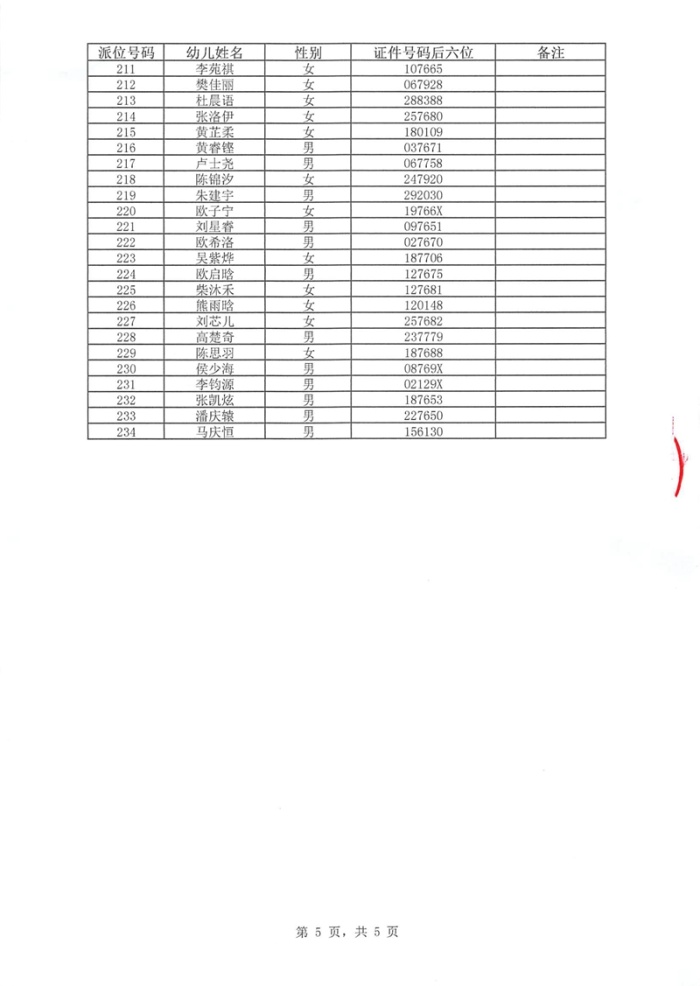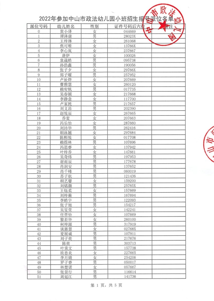 2022年参加中山市政法幼儿园小班招生摇号派位名单公示