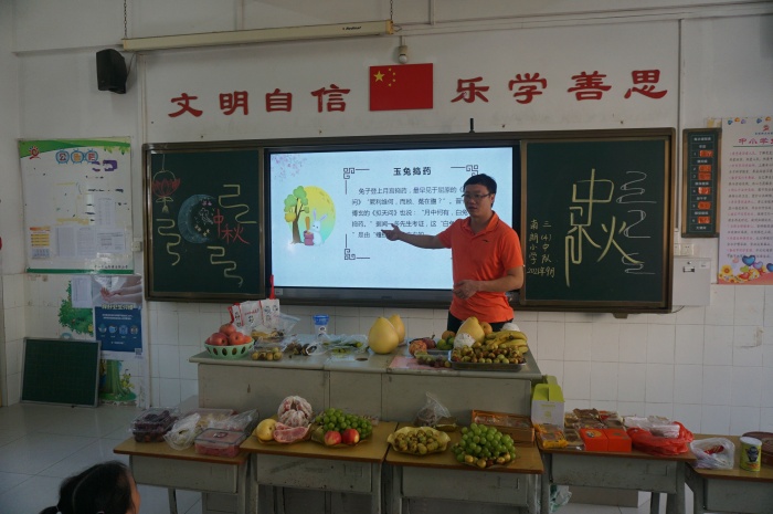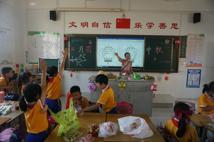 课室里,装饰着孩子们亲手制作的节日灯笼。讲台上,教师向孩子们介绍了中秋节的来源和有关的民间故事,让他们七嘴八舌话中秋。接着带领孩子们了解当地中秋节传统习俗,通过品尝菱角、板栗、花生、月饼等南朗本地应节食品,感受传统节日气氛。童稚的声音吟诵着许许多多有关中秋节的诗歌,倾诉孩子们对传统节日的好奇与期待。此外,学生们还在课堂上讨论了当代背景下,如何文明过好有意义的中秋节。