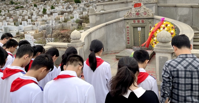 全体师生排着整齐的队伍,依次将纸花摆放在先贤墓前,并深深鞠躬,表达对先贤的敬意与思念。红色基因宣讲员孔德树、陈琳分别代表学生表达了对先人的崇敬和哀思,号召全体少先队员用先贤的崇高理想、伟大精神来净化心灵、提升境界,把内心激荡的爱国之情、报国之志化作刻苦学习、勇攀高峰的不懈动力和实际行动。接着,全体党员、团员、少先队员们在墓前庄严宣誓,承诺努力学习和弘扬先辈的爱国爱乡精神,从现在做起,从身边小事做起,力争为祖国、为人民,为家乡贡献自己的力量。