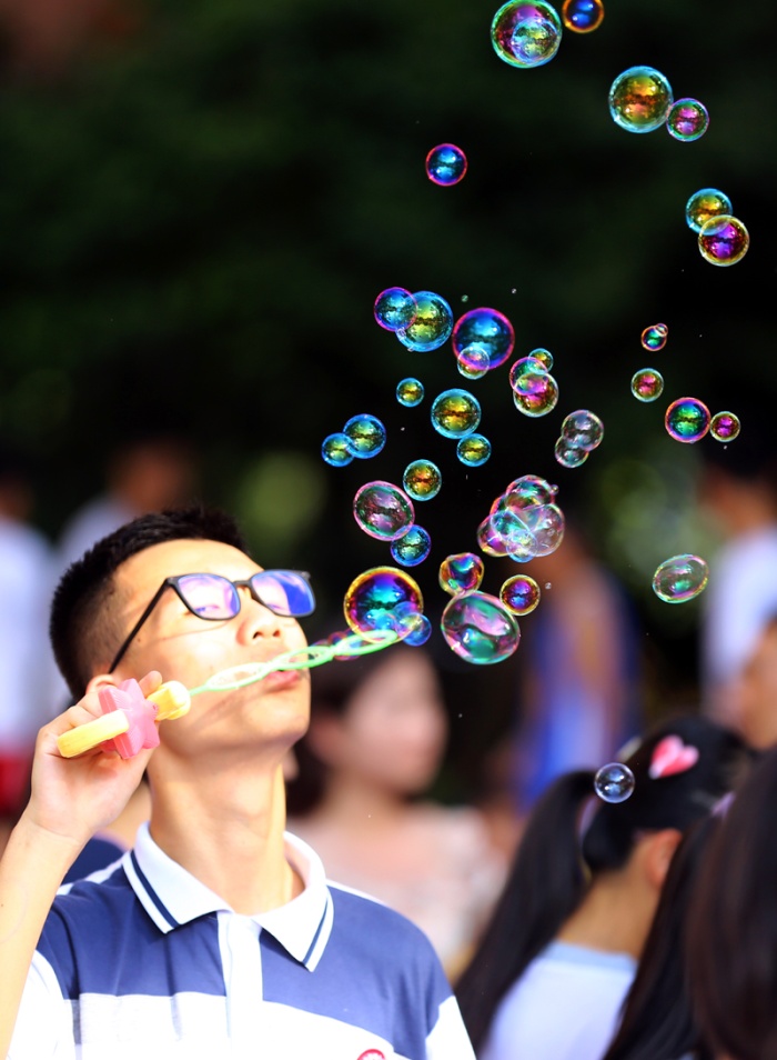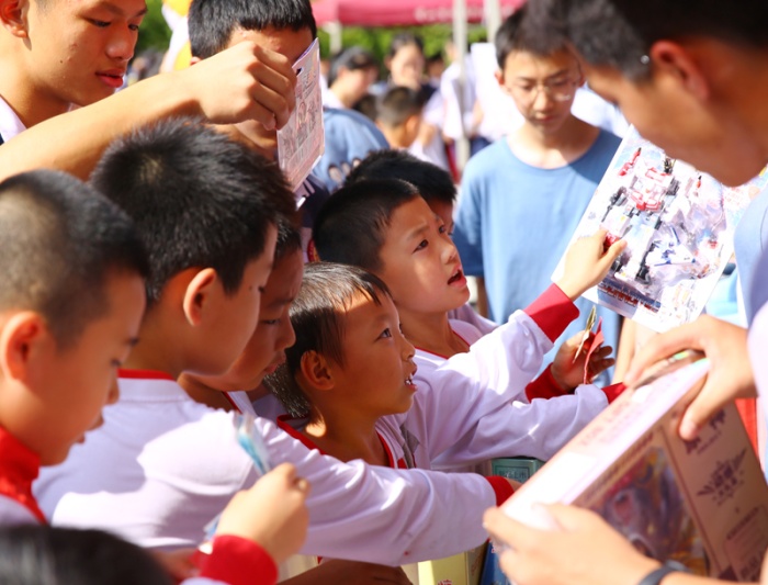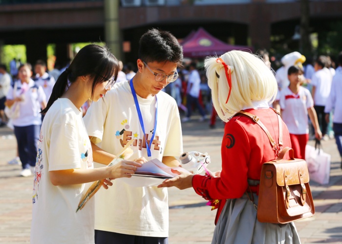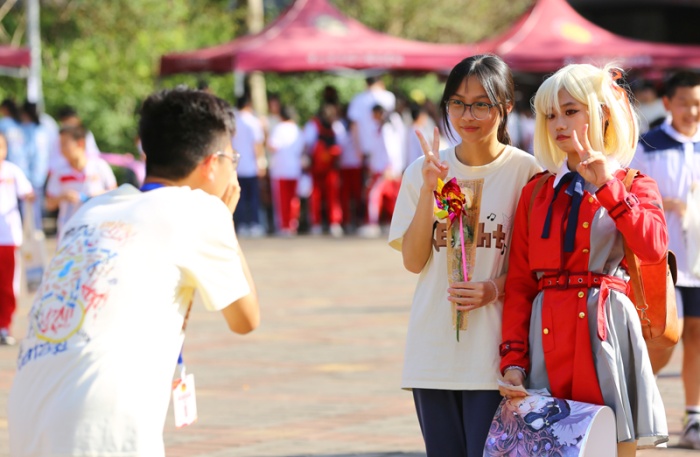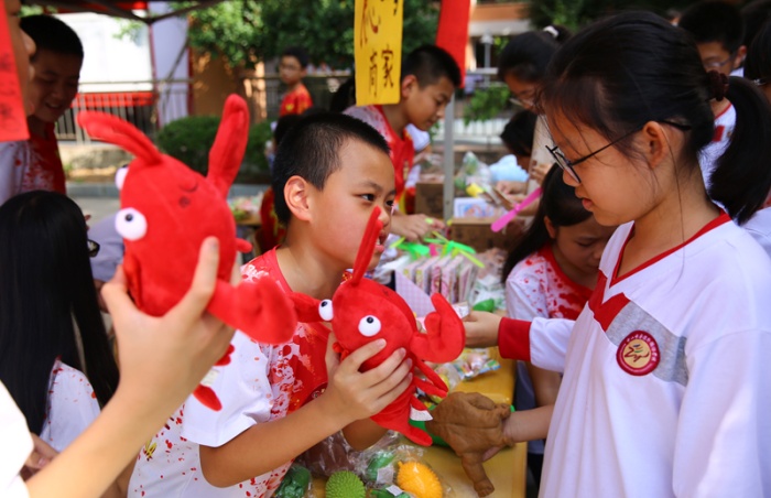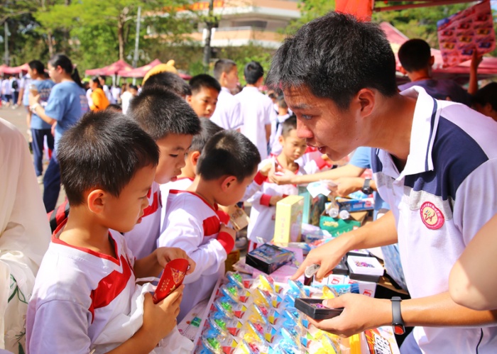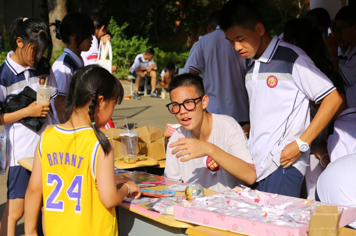 “买它!买它!”“要想买得好,请往这边走,要想划得来,请往这边来!”“只有你想不到,没有你买不到!”下午一点,学校中心广场人头攒动,大大小小的摊位上商品琳琅满目,精美的手办、自制的手工艺品、绘画作品、玩具、饰品、文具、美食等商品一应俱全。师生化身销售员和顾客,叫卖的叫卖、购买的购买,一起为公益助力。
